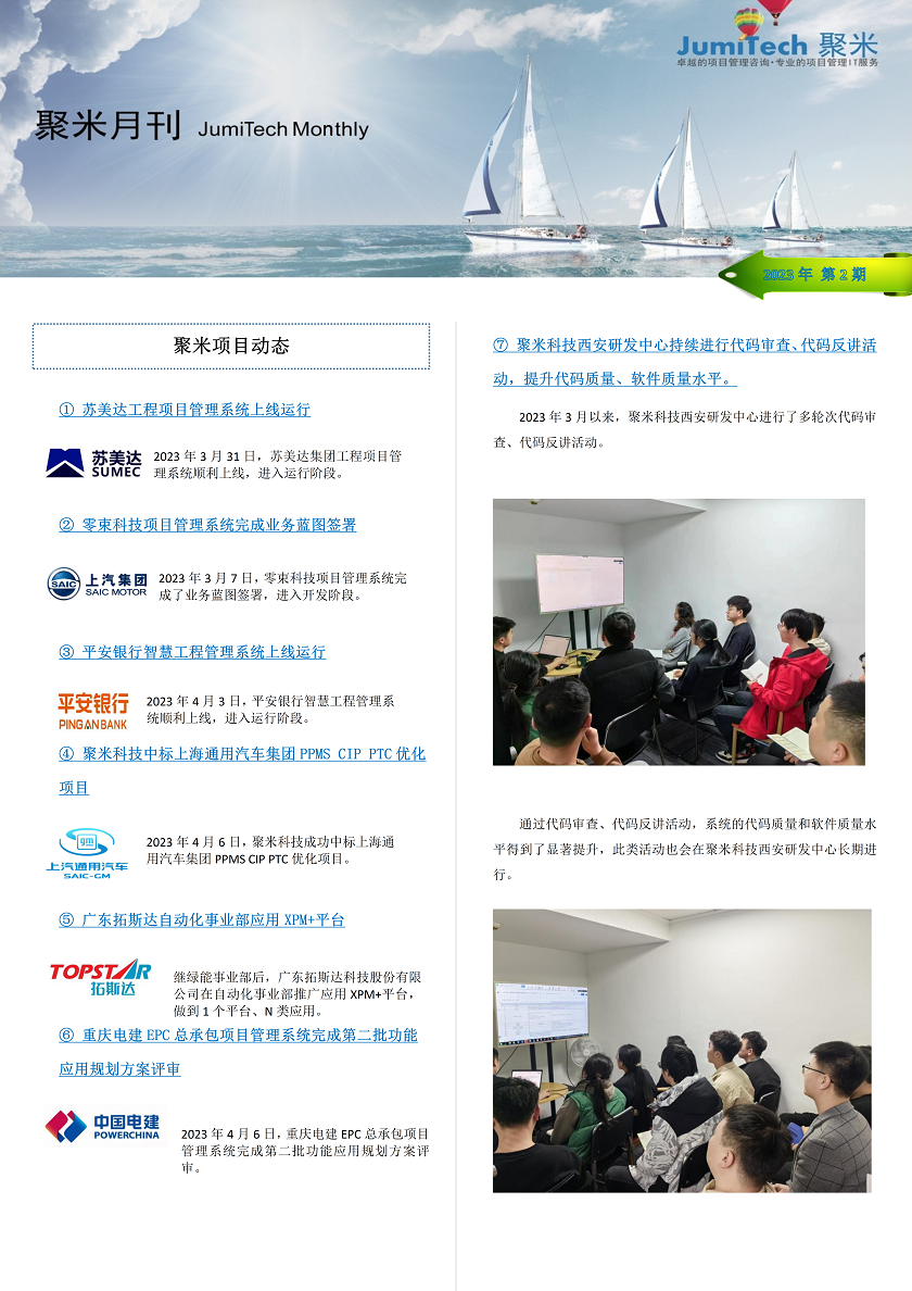 1、蘇美達(dá)工程項(xiàng)目管理系統(tǒng)上線運(yùn)行;2、零束科技項(xiàng)目管理系統(tǒng)完成業(yè)務(wù)藍(lán)圖簽署;3、平安銀行智慧工程管理系統(tǒng)上線運(yùn)行;4、聚米科技中標(biāo)上海通用汽車集團(tuán)PPMS CIP PTC優(yōu)化項(xiàng)目;
