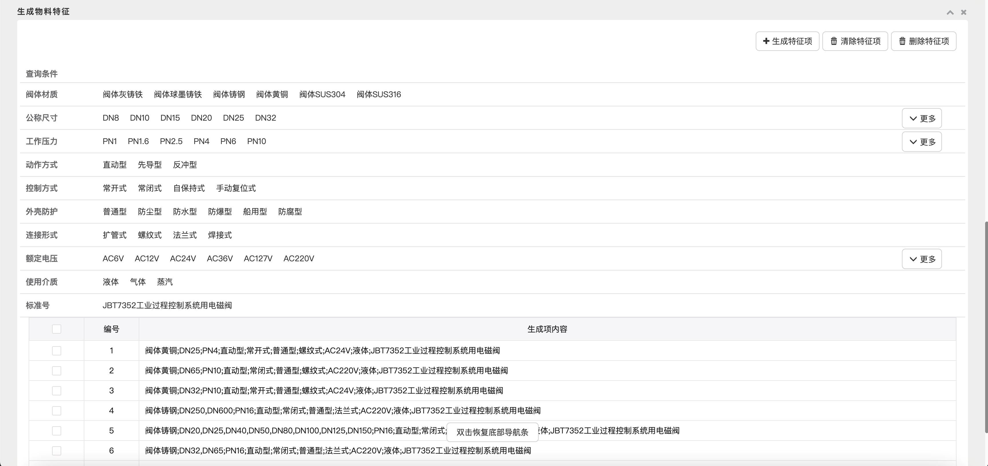 項目物料編碼庫是在物料特征維護(hù)的基礎(chǔ)上,基于聚米自身的核心算法(按照物料特征明細(xì)的笛卡爾乘積生成物料)、輔以人工檢查、AI檢查構(gòu)建的一套有效物料編碼系統(tǒng)。