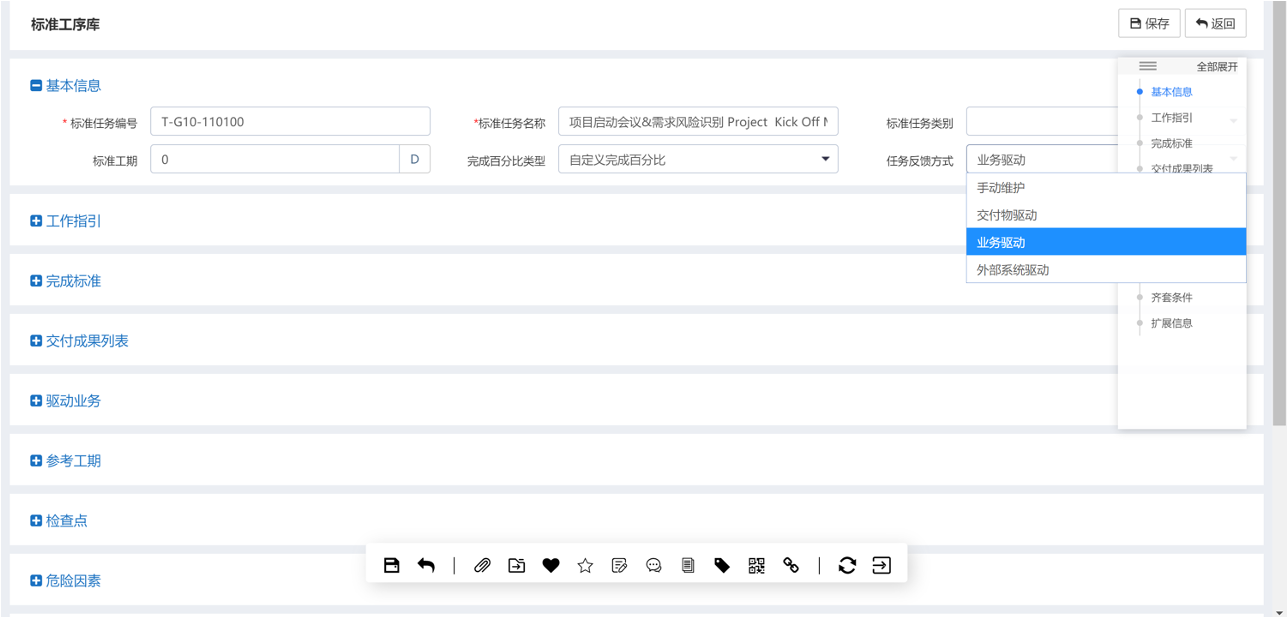 計劃模板中的標準任務,涵蓋任務描述、標準工期、邏輯關(guān)系、工作指引、完成標準、交付物成果、驗收條件、所需資源、經(jīng)驗教訓等內(nèi)容。