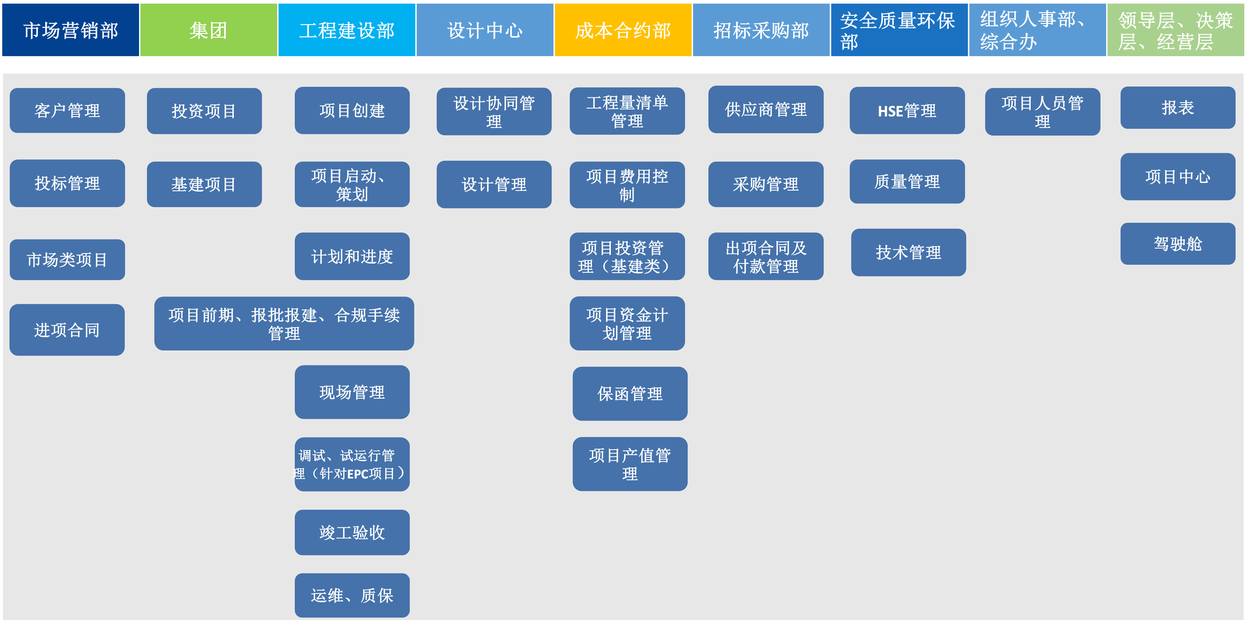 系統(tǒng)將工程從項(xiàng)目前期、設(shè)計(jì)、采購、施工、竣工到后評(píng)估、運(yùn)維,進(jìn)行全過程、全方位的協(xié)同項(xiàng)目管理,將項(xiàng)目分包商、供應(yīng)商集中在一個(gè)系統(tǒng)平臺(tái)上,實(shí)時(shí)對(duì)項(xiàng)目的計(jì)劃和進(jìn)度、預(yù)算和成本、質(zhì)量和安全、圖紙文檔、設(shè)計(jì)、采購、施工、調(diào)試、驗(yàn)收進(jìn)行全方位全過程監(jiān)控預(yù)警和協(xié)同。