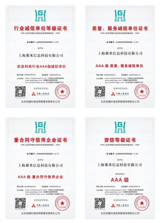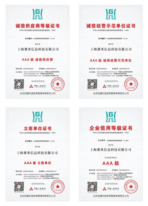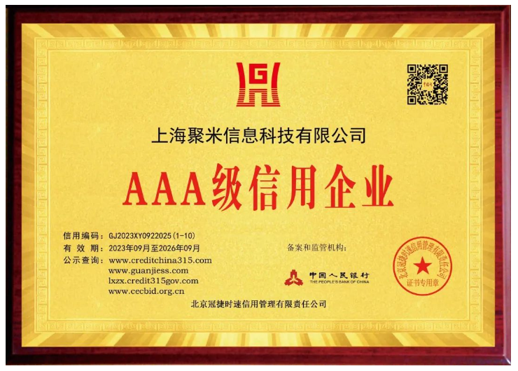 這代表了企業(yè)信用評價的最高級別,未來聚米將始終堅持,誠信立企,守信經(jīng)營。
