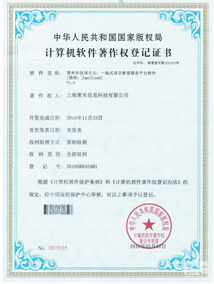 近日,聚米科技喜獲由中華人民共和國國家版權局頒發(fā)的計算機軟件著作權證書:《聚米科技項目云:一站式項目管理服務平臺軟件[簡稱:JumiClo