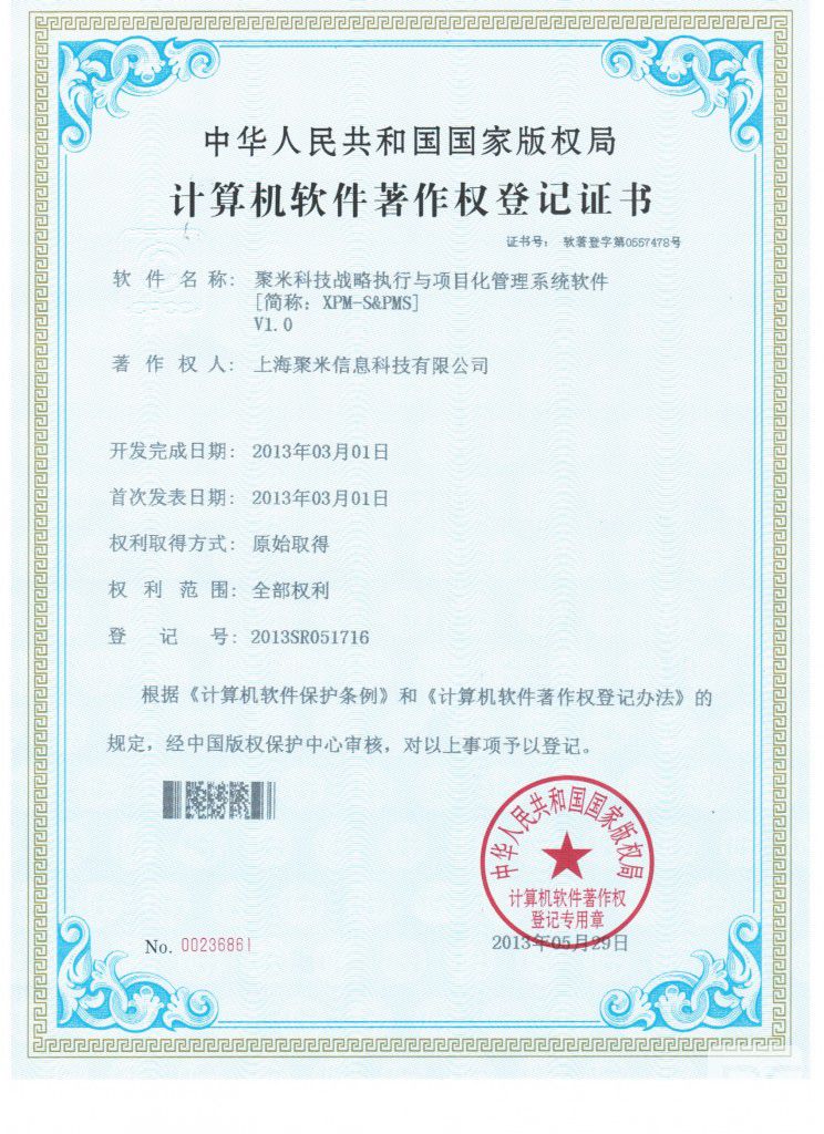 近日,聚米科技喜獲有中華人民共和國國家版權(quán)局頒發(fā)的兩項計算機(jī)軟件著作權(quán)證書,分別為《聚米科技全生命周期投資項目管理系統(tǒng)軟件[簡稱:XPM-Portal]V1.0》、《聚米科技戰(zhàn)略執(zhí)行與項目化管理系統(tǒng)軟件[簡稱:XPM-S&PMS]V1.0》。